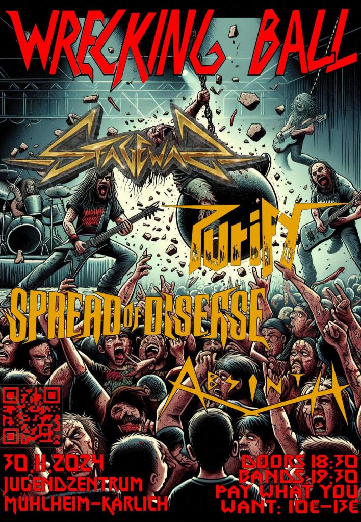 On 30th November 2024 we will have a Thrash Metal Night called WRECKING BALL in MĂœHLHEIM-KĂ„RLICH (RLP). We are looking forward to play with PURIFY, SPREAD OF DISEASE and ABSINTH!